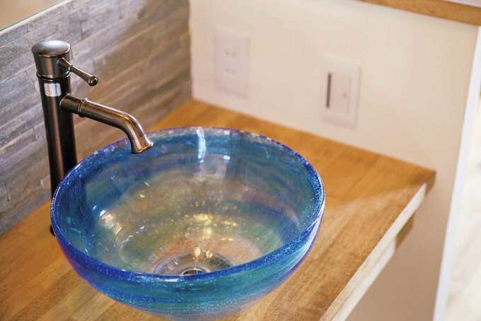 玄関ホール正面に配した洗面台は 奥さまが一目惚れしたというかわいらしいブルーガラスの洗面ボウルがポイント 前の壁を石張りにし インダストリア
